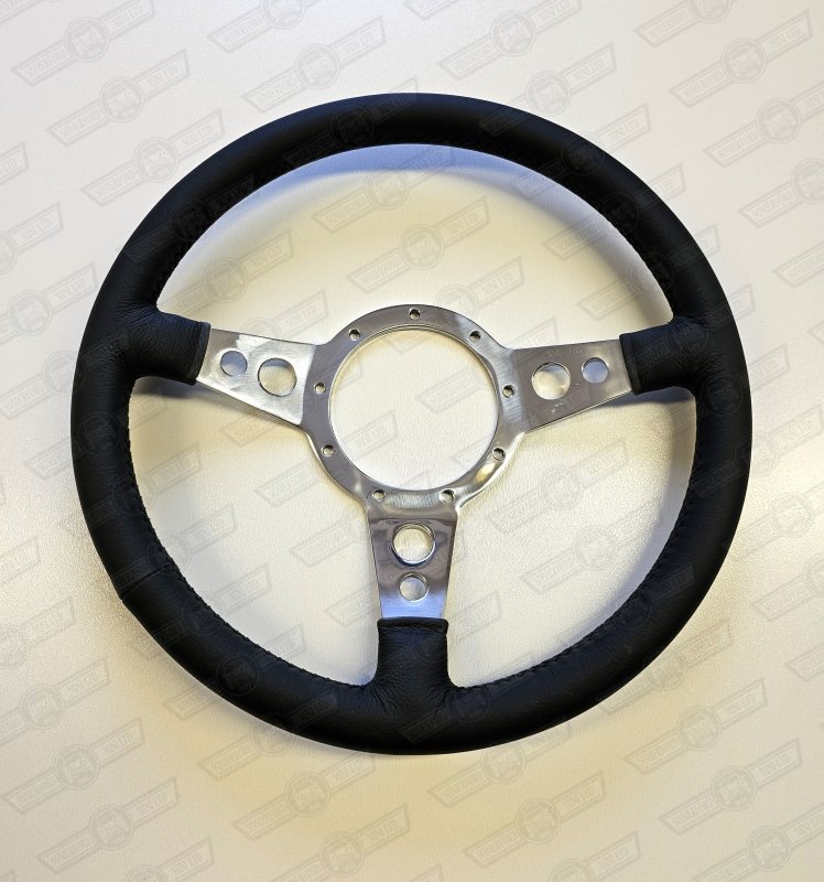 13'' diameter. Soft black leather over polished alloy dished spokes. Thin rim version. Many other options are available- please enquire.