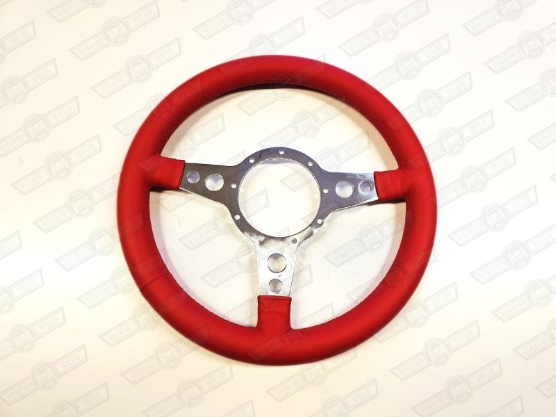 14'' diameter. Soft red leather over polished alloy flat spokes. Many other options are available- please enquire.